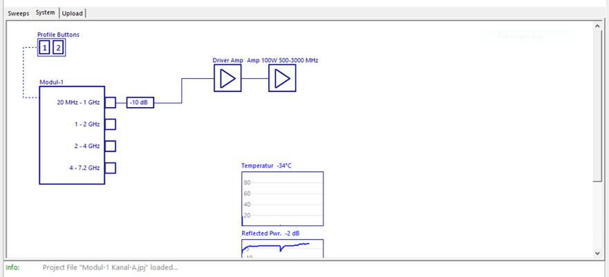 Furthermore the software will directly display the effect of programming in the jamming graphics. Calculated jamming signal strength, sweeping speed, automatic distribution of the jamming signals and output power will be shown in the graph(s).
