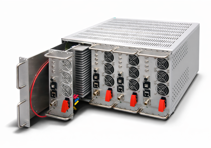 The new XWJ2X modular jamming module is made out of two cut outs of one aluminum piece by a CNC-machine. This ensures highest HF-denseness. In addition passive heat sink and/ or active cooling depending on jamming operations are already included. For jamming operations, longer then 5 – 10 minutes additional active heat sink through fans are integrated.